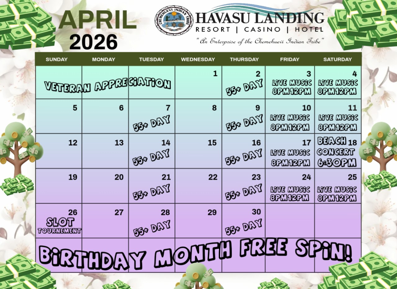 At Havasu Landing Casino, we host different events throughout the month and more. Check out current events, and come back each week to see a new event popup that will bring entertainment to friends and family. We look forward to seeing you at one or more events.